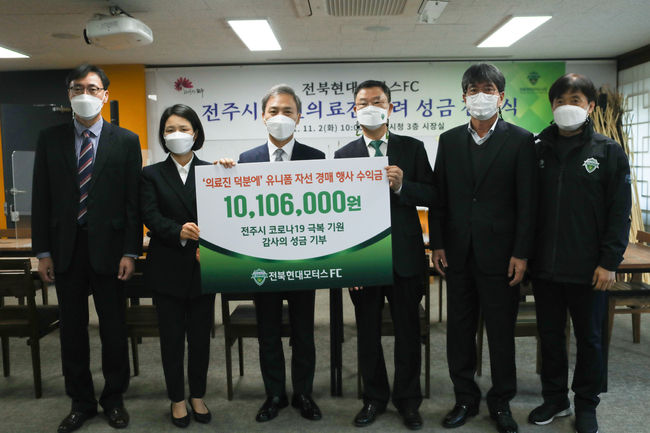 전북은 2일 오전 전주시청을 방문해 ‘의료진 덕분에’ 실착 유니폼 등 자선 경매 행사를 통해 발생한 수익금 10,106,000원 전액을 전주시에 전달했다.
