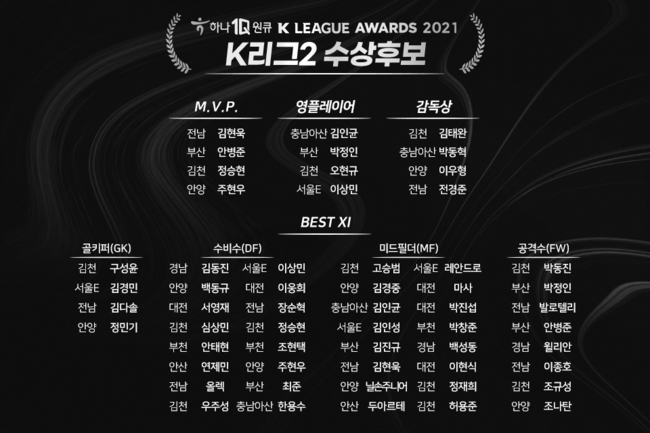 K리그2 최우수감독상 후보에는 김태완(김천), 박동혁(충남아산), 이우형(안양), 전경준(전남) 등 4명의 감독들이 이름을 올렸다.