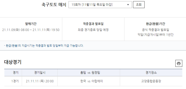 2022 카타르 월드컵 아시아지역 최종예선 조별리그 A조 5차전, 대한민국-아랍에미리트전 대상 축구 매치 15회차 발매