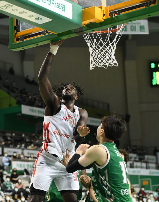 서울 SK는 13일 원주종합체육관에서 열린 2021-2022 KGC인삼공사 정관장 프로농구 원주 DB와 원정경기에서 77-67로 이겼다.