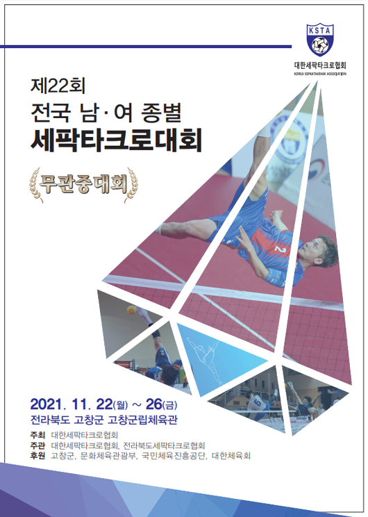 대한세팍타크로협회(회장 오주영)가 주최하고 전라북도세팍타크로협회가 주관하는 제22회 전국 남‧여 종별 세팍타크로대회가 11월 22월(월)부터 26일(금)까지 고창군 고창군립체육관에서 개최한다.
