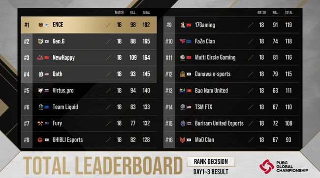 젠지는 21일 오후 인천 영종도 파라다이스 시티 플라자에서 열린 ‘펍지 글로벌 챔피언십(이하 PGC) 2021’ 순위결정전 B-C조 경기까지 총점 165점(88킬)을 기록하면서 ‘위클리 서바이벌’에 선착했다. 젠지를 포함해 8위 기블리(128점, 82킬), 12위 다나와(115점, 79킬), 16위 매드 클랜(93점, 67킬)이 1주차 ‘위클리 서바이벌’ 첫 경기부터 나서게 됐다.