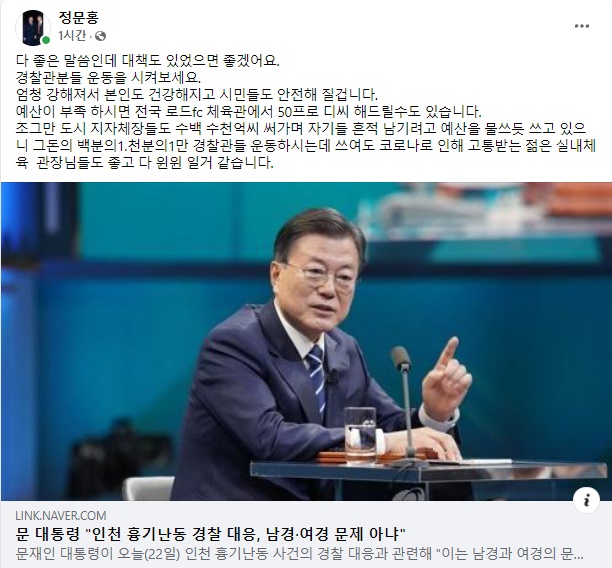 정문홍 회장은 22일 자신의 SNS에 인천 흉기 난동 사건에 대한 질문을 받은 문재인 대통령의 답변 기사를 공유했다. 또한 정문홍 회장은 “다 좋은 말씀인데 대책도 있었으면 좋겠어요”라며 대책의 필요성을 강조했다.