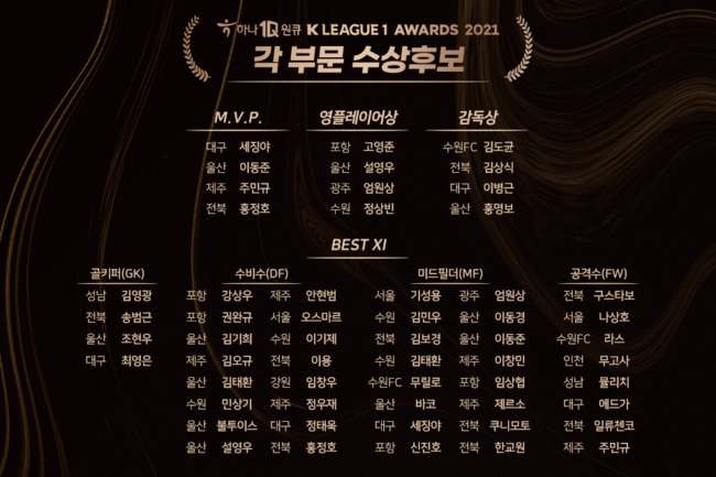 선정된 후보들을 대상으로 30일(화)부터 각 구단 감독(30%), 주장(30%), 미디어(40%) 투표를 진행하여 최종 수상자를 가린다. K리그1 개인상 최종 수상자는 내달 7일(화) 서울 홍은동 스위스그랜드호텔에서 열리는 '하나원큐 K리그1 2021 대상 시상식'에서 발표된다.