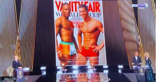 시상자로 나선 디디에 드록바가 단상에 서자 무대의 스크린에 드록바와 호날두가 과거 속옷차림으로 잡지 표지모델을 했던 사진이 공개됐다. 순식간에 장내가 웃음바다로 변했다.