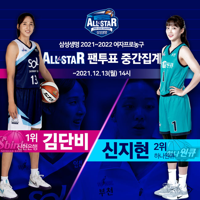 ‘삼성생명 2021~2022 여자프로농구 올스타' 팬 투표 중간 집계 결과 김단비(신한은행)가 1위에 올랐다.