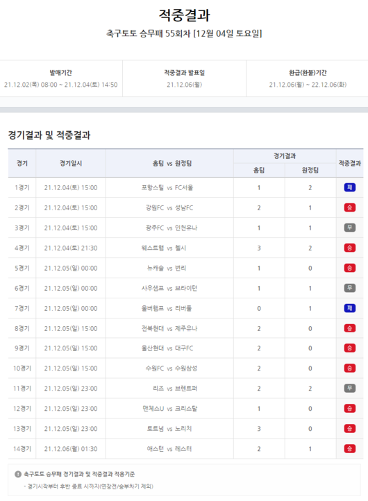 국내∙외 프로축구 14경기 대상 축구토토 승무패 55회차 적중결과