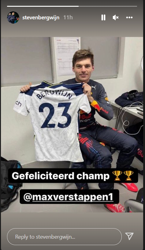 스티븐 베르바인(24, 토트넘)이 새로운 F1 챔피언에 오른 막스 베르스타펜(24, 레드불)에게 축하메시지를 보냈다.