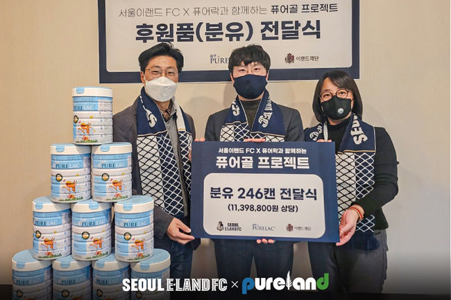 ‘퓨어골 프로젝트’는 서울 이랜드 FC가 득점을 기록하면 1득점 당 퓨어랜드 프리미엄 분유 ‘퓨어락 로열플러스’가 6캔 적립되는 프로그램이다.