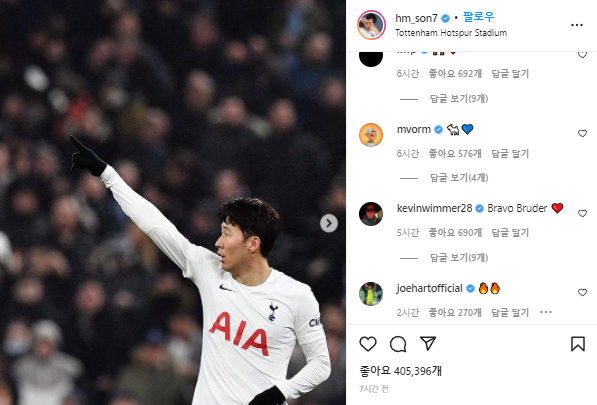 과거 토트넘서 손흥민과 함께 뛰었던 미하엘 포름 역시 손흥민에게 염소(GOAT) 이모티콘을 보냈다. 토트넘서 손흥민의 절친으로 알려졌던 케빈 비머는 "내 친구, 너무 자랑스럽다"라고 기쁨을 함께했다.