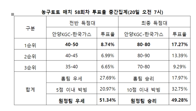 2020-21시즌 KBL 안양KGC-한국가스전 대상 농구매치 58회차 중간집계 결과
