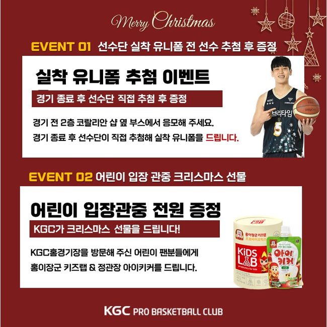 안양KGC인삼공사는 23일 "25일(토) 홈경기에서 크리스마스 이벤트를 진행한다"고 전했다.