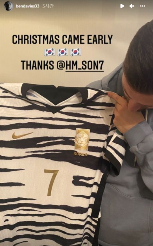 토트넘 수비수 벤 데이비스는 25일 자신의 SNS에 손흥민에게 받은 선물을 자랑하는 게시물을 올렸다. 데이비스는 손흥민의 등번호 7번이 새겨진 대한민국 ‘백호 유니폼’을 선물로 받았다. 데이비스는 “크리스마스가 일찍 왔네”라며 태극기까지 새기면서 기쁨을 표했다.