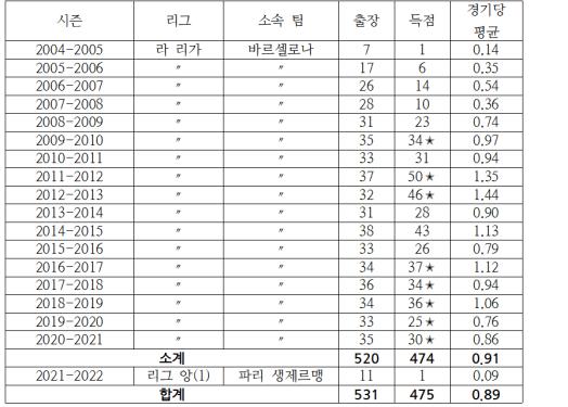 메시가 라 리가에서 뛴 17시즌(2004-2005~2020-2021)은 그의 시대였다. 그는 라 리가 역사를 온통 그의 빛나는 기록으로 수놓았다. 라 리가 각종 최다골을 그의 몫으로 만들었다. 가장 눈부신 통산(520경기-474골-경기당 평균 0.91골)을 비롯해 ▲ 한 시즌(50골·2011-2012) ▲ 한 해(59골·2012년) 등에선, 그의 화려한 골 자취가 배어난다.