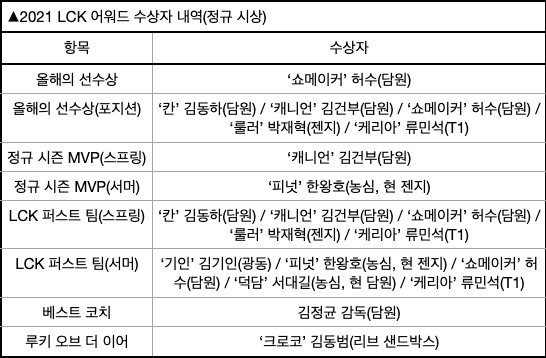 2021년 ‘LOL 챔피언스 코리아(이하 LCK)’ 내 최고의 선수를 뽑는 자리에서 담원의 미드 라이너 ‘쇼메이커’ 허수가 무려 7관왕에 오르는 영예를 안았다.