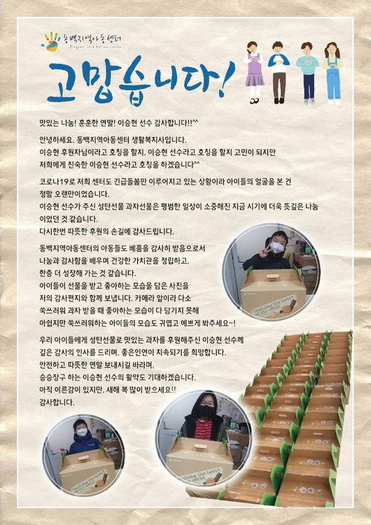 이승현은 지난 성탄절에서도 과자박스를 지역아동센터의 어린이들에게 전달했다. 동백지역아동센터 생활복지사는 “이승현 선수가 주신 성탄선물 과자선물은 평범한 일상이 소중해진 지금 시기에 더욱 뜻깊은 나눔이었다. 다시 한 번 따뜻한 후원의 손길에 감사드립니다”라고 감사편지를 남겼다.