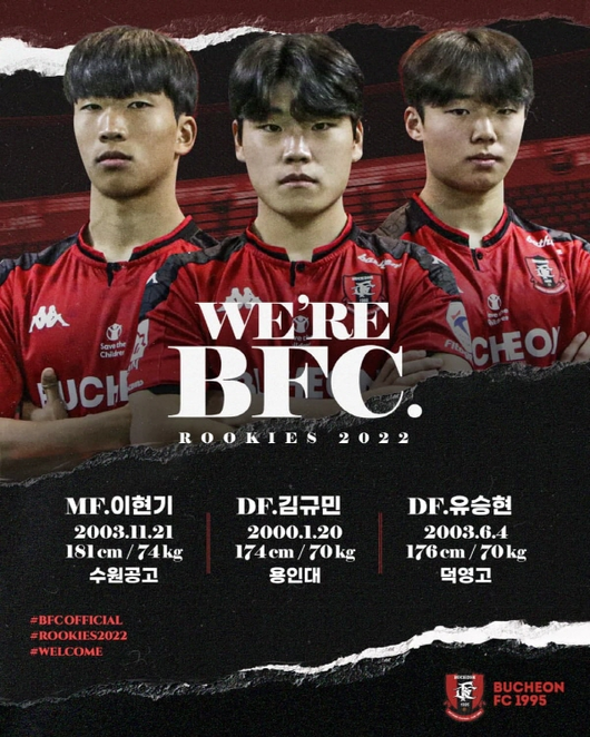 부천FC1995(이하 부천)는 31일 "김규민, 유승현, 이현기를 신인선수로 영입해 22세 이하(U-22) 자원을 보강했다"고 밝혔다