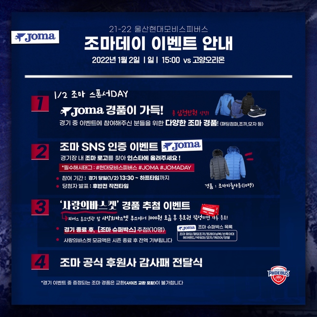 현대모비스와 JOMA는 지난 17-18시즌부터 5시즌 동안 타이틀 용품 스폰서 관계를 꾸준히 이어오며 매 시즌 JOMA DAY를 성황리 진행해왔다. 이번 2021-2022시즌에도 JOMA를 용품 후원사로 두고 있는 KBL 내 다른 팀 고양오리온과의 홈경기에 JOMA DAY를 준비했다. 양 팀 선수들이 직접 사용하는 스포츠용품을 경품으로 걸고 다양한 이벤트를 진행한다는 계획이다.