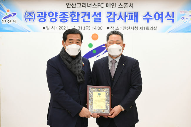 안산그리너스FC(구단주 윤화섭)가 광양종합건설(대표 최석배)에 감사패를 전달했다.