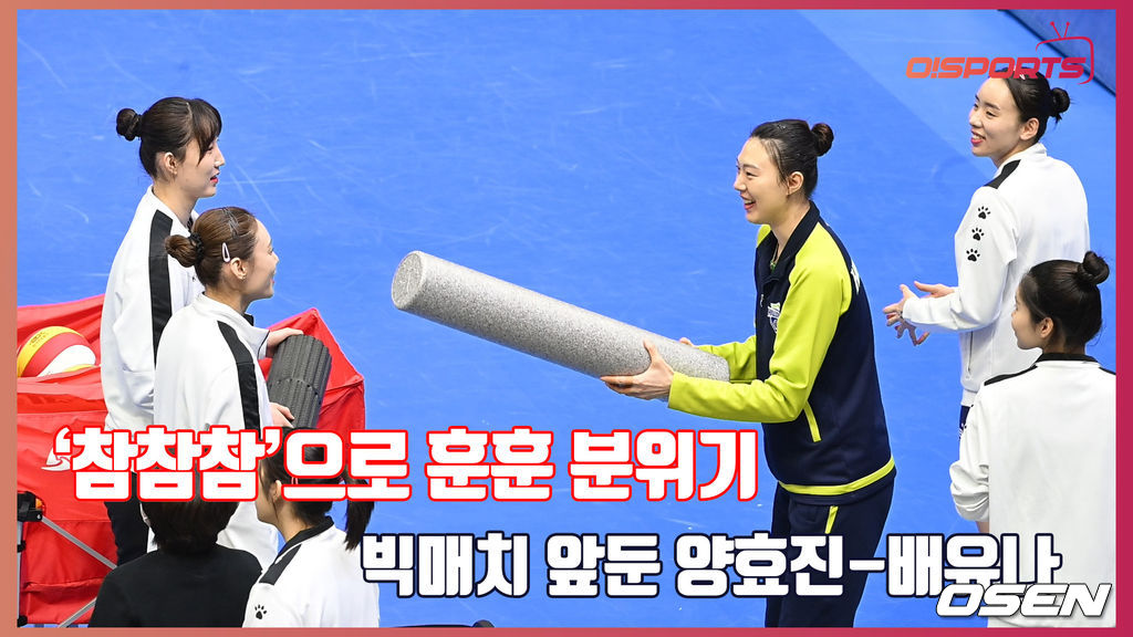 연승을 달리는 현대건설과 한국도로공사의 빅매치를 앞두고 양효진과 배유나가 ‘참참참’ 게임으로 인사하며 코트를 훈훈함으로 물들였다.
