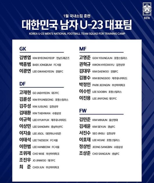 대한축구협회는 지난 4일 U-23 대표팀 훈련 소집 명단을 발표했다. U-23 대표팀은 10일부터 29일까지 제주도 서귀포에서 동계훈련을 펼친다.