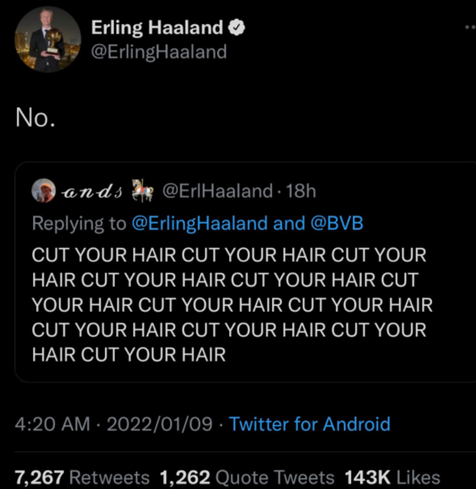 해외 축구 팬들 역시 장발 파마에 헤어 밴드를 한 홀란드는 낯설었던 것 같다. 포포투는 SNS에 여러 팬들이 홀란드에게 머리를 가다듬기를 요청했다. 한 팬의 집요한 이발 요청에 홀란드는 간단하게 '싫어'라고 화답했다.