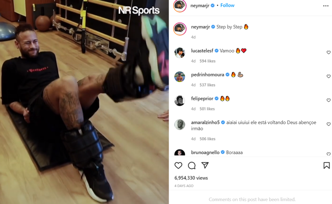 네이마르는 7일 SNS에서 자신의 재활과정이 담긴 동영상을 공개했다. 네이마르는 “step by step(차근차근)”이라는 메시지와 함께 재활에 열중하고 있는 모습을 공개했다.