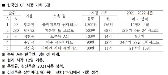 이에 따르면, 황희찬(울버햄프턴 원더러스)이 한국인 CF 명맥을 이을 으뜸의 후보로 나타났다. 잉글랜드 프리미어리그를 둥지로 삼은 황희찬은 지구촌 곳곳에서 활약하는 한국인 CF 가운데 최고의 시장 가치를 지녔다고 평가받았다. 1,300만 유로(한화 약 176억 원)로, 2위에 자리한 황의조(지롱댕 드 보르도)를 큰 격차로 압도했다. 황의조는 500만 유로(약 68억 원)였다(표 참조).