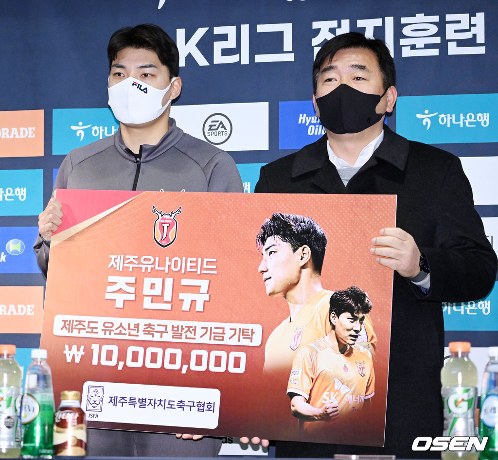12일 오전 10시 제주 서귀포의 빠레브 호텔 기자회견장에서 열린 하나원큐 K리그 2022 전지훈련 1차 미디어 캠프 기자회견에서 주민규는 제주특별자치도축구협회를 통해 제주도 유소년 축구발전기금 1,000만 원 전달식을 가졌다.
