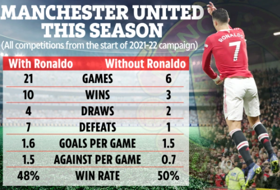 더 선은 호날두가 출전한 맨유와 호날두가 출전하지 않은 맨유의 승률을 비교 분석했다. 놀랍게도 후자가 더 뛰어난 승률을 보였다.