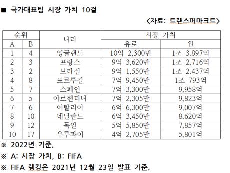 이 측면에서, 오래도록 FIFA 랭킹 1위를 지키고 있는 벨기에가 10위권에 들어가지 못한 점은 뜻밖이다. ‘붉은 악마(De Rode Duivels)’로 불리는 벨기에 국가대표팀의 시장 가치는 11위로 매겨졌다. 3억 9,850만 유로(약 5,414억 원)였다. 세계에서 가장 뛰어난 공격형 미드필더로 손꼽히는 케빈 더 브라위너(7위·약 9,000만 유로)가 최고의 시장 가치를 지녔다고 나타났다.10회 연속 월드컵 본선 진출 위업을 눈앞에 둔 한국은 예상 밖으로 75위에 그쳤다. 2,263만 유로(약 307억 원)로, AFC(아시아축구연맹) 내에서도 이란→ 우즈베키스탄→중국→ 호주→ 일본에 이어 6위였다.그러나 이번 시장 가치 순위가 2022년에 구성된 국가대표팀을 기반으로 한 데서 말미암은 어쩔 수 없는 외형이었다. 부상으로 빠진 월드 스타 손흥민이 들어갔을 경우 AFC 최상위권에 자리매김했을 듯하다. 8,000만 유로(약 1,087억 원)의 손흥민은 세계 15위의 시장 가치를 지녔다고 평가받고 있다.