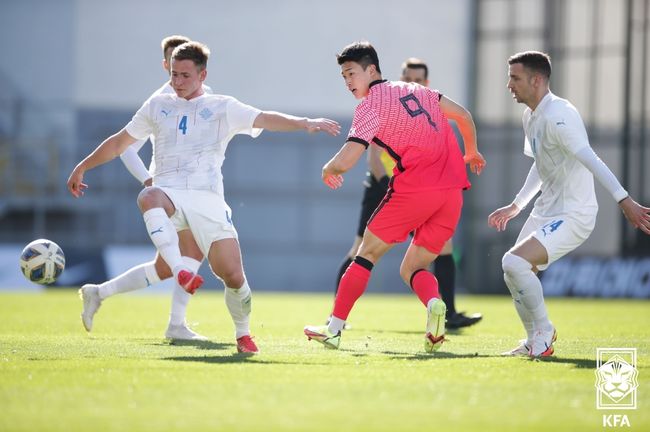 그러나 수비진의 제외하고 젊은 선수들을 주로 출전 시킨 한국은 아이슬란드와 대결서 전혀 주눅들지 않고 경기에 임했다. 김진규의 패스를 받은 조규성이 선제골을 터트린 한국은 아이슬란드를 쉴새 없이 몰아쳤다.