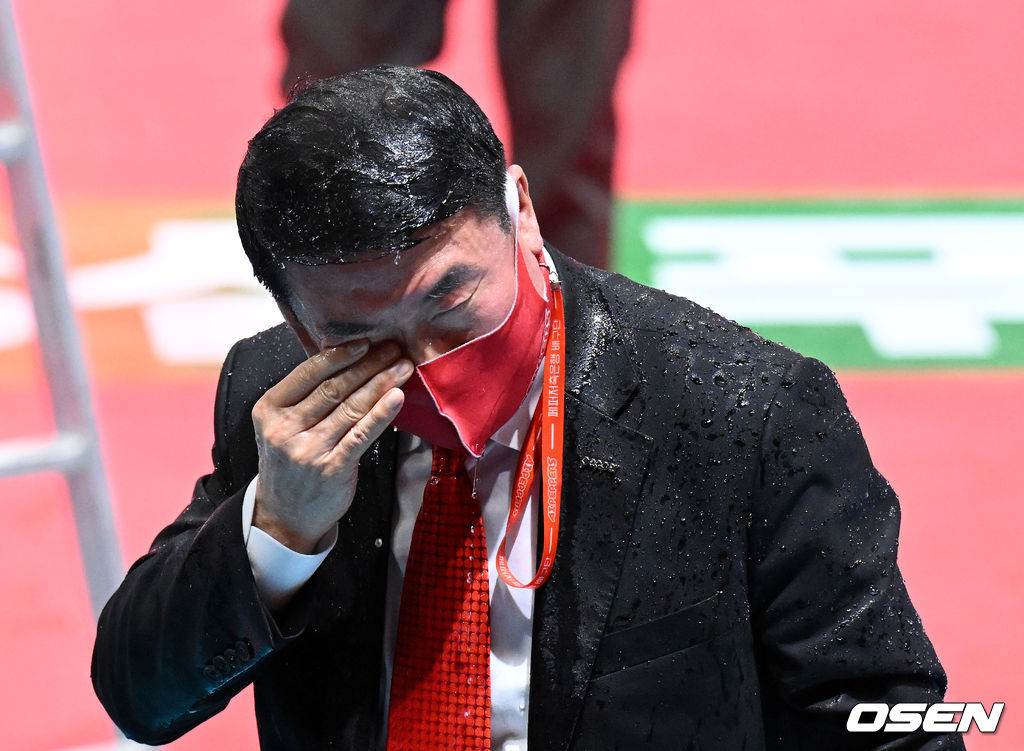 이어 선수단은 수훈 선수 인터뷰를 마친 박경현과 김형실 감독에게 축하 물세례를 펼치며 홈 첫승의 기쁨을 만끽했다. 2022.01.18 /sunday@osen.co.kr