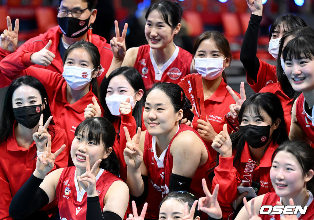이어 선수단은 수훈 선수 인터뷰를 마친 박경현과 김형실 감독에게 축하 물세례를 펼치며 홈 첫승의 기쁨을 만끽했다. 2022.01.18 /sunday@osen.co.kr