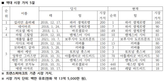 역대 시장 가치 5걸(12명)을 보유한 클럽은 모두 9개다. 파리 생제르맹·맨체스터 시티·리버풀·바르셀로나가 각각 2명씩이고, 보루시아 도르트문트·토트넘 홋스퍼·아틀레티코 마드리드·첼시가 각기 1명씩이었다. 맨체스터 시티와 파리 생제르맹은 현재 선수 총합 시장 가치 1, 2위 팀다운 면모였다.