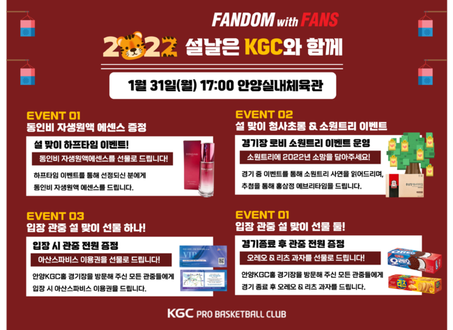 31일(월) 경기에는 여성 관중을 대상으로 KGC인삼공사 “동인비 자생원액 에센스”를 이벤트를 통해 열 분께 증정한다. 또한 입장하시는 관중 전원에게는 경기 전 아산 스파비스 이용권 2매와, 경기 후 달콤한 오레오 과자를 제공한다. 한편, 하프타임에는 올 한해 바램을 “2022년 소원트리”에 적어주신 팬들 중 추첨을 통해 KGC인삼공사 “홍삼정 에브리타임”을 증정한다.