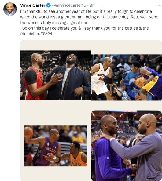 코비의 사망 2주년에 각계각층에서 추모행렬이 이어지고 있다. 현역시절 라이벌이었던 빈스 카터는 “인생을 더 살 수 있음에 감사하지만 최고의 친구였던 코비를 잃은 것은 아직도 힘들다. 코비가 편안하게 지냈으면 좋겠다. 그와의 우정을 기념하며 그와 대결했던 사진을 올린다”며 코비와 대결한 사진을 SNS에 올렸다.