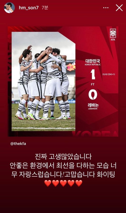 손흥민은 자신의 SNS에 “진짜 고생 많았습니다. 안 좋은 환경에서 최선을 다하는 모습 너무 자랑스럽습니다! 고맙습니다. 파이팅”이라며 하트 이모지를 덧붙였다.