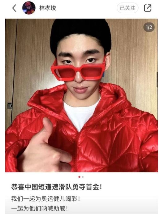 린샤오쥔은 5일 중국의 혼성 계주 금메달이 확정된 직후 중국판 인스타그램인 샤오훙수에 엄지척을 하는 사진과 글을 게재했다.