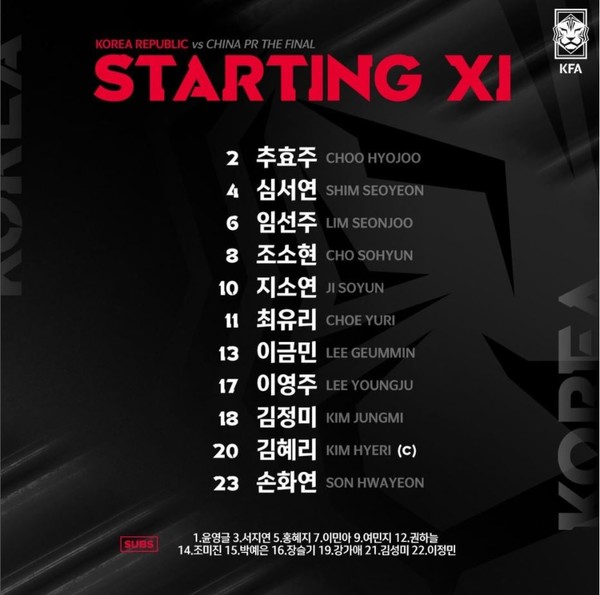 벨 감독은 필리핀전과 마찬가지로 베스트 라인업을 출격시켰다. 손화연-추효주-이금민-최유리-지소연-조소현-심서연-이영주-임선주-김혜리-김정미가 출격한다.