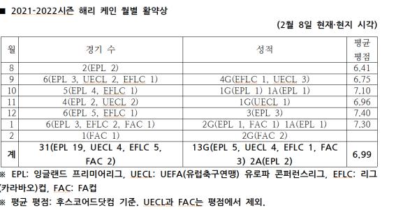 케인은 뉴캐슬전 활약(1골 1어시스트)으로 평균 평점이 7점대(7.10)로 올라가며 반등의 기미를 찾는 듯싶었다. 그러나 11월 EPL 4경기에서 더는 이렇다 할 결과물을 만들지 못하면서 평균 평점이 다시 6점대(6.96)로 떨어졌다.