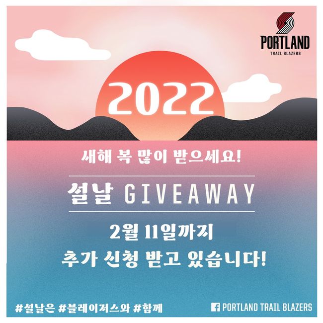 포틀랜드 트레일 블레이저스 공식페이스북 페이지는 한국의 설날을 맞아 특별한 경품이벤트를 진행하고 있다. 포틀랜드 페이스북 페이지에서 ‘좋아요’를 누르고 #TrailBlazersKR 해시태그와 함께 게시물을 공유한 뒤 댓글에 친구 2명을 태그해 페이지 팔로우를 유도하는 미션을 수행하면 ‘경품증정행사’(giveaway)에 참여할 수 있다.