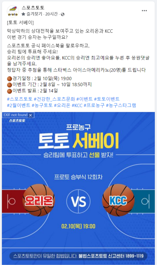 이벤트에 참여하기를 원하는 사람은 스포츠토토 공식 페이스북 페이지의 해당 게시물에 방문해 오리온스 승리 예상에는 ‘좋아요’, KCC의 승리 예상에는 ‘최고에요’를 선택해 누른 후 응원 댓글을 남기면 응모가 완료된다. 이후 경기 결과를 정확히 예측한 20명에게는 추첨을 통해 스타벅스 아이스 아메리카노 기프티콘을 증정한다.