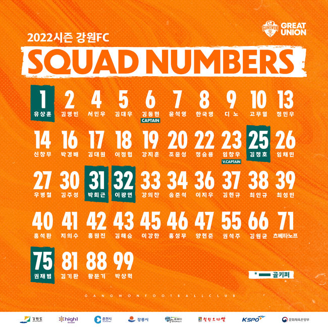 강원FC의 2022 시즌 선수단 등번호가 확정됐다.