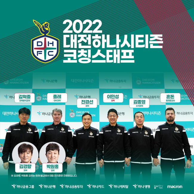이민성 감독을 중심으로 A팀은 김종영 수석코치, 진경선 코치, 졸레 GK코치, 혼돈 피지컬 코치, 김혁중 전력 분석 코치, B팀은 김경량 코치, 박원홍 코치 체제로 대전은 2022시즌 K리그1 승격과 구단의 미래를 이끌 선수 육성 두 가지 목표를 모두 잡겠다는 각오다.