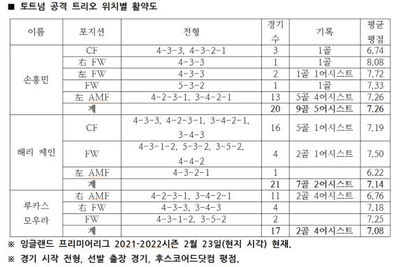 손흥민이 얼마나 다양한 연기를 펼쳤느냐는 객관적으로도 입증된다. 자신과 함께 토트넘의 공격 삼각편대를 이루는 해리 케인과 루카스 모우라를 압도함이 기록에서도 그대로 나타난다. 이번 시즌에, 손흥민은 다섯 자리에서 능숙하게 연기를 소화했다(이하 현지날짜 2월 22일 현재). 반면 케인과 모우라는 각각 세 자리씩을 소화하는 데 그쳤다(표 참조).
