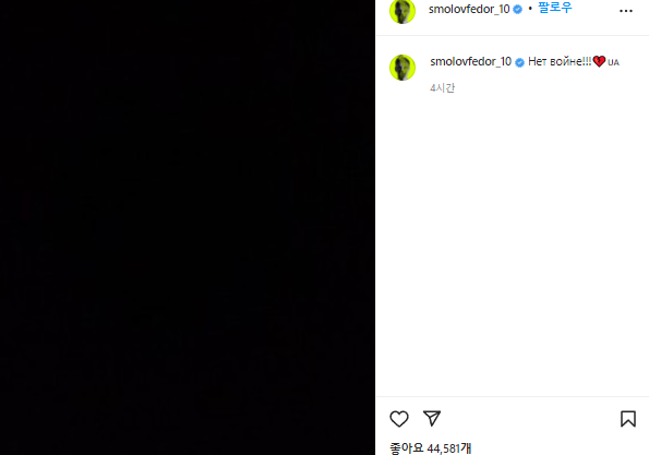 스몰로프는 자신의 SNS에 검은 사진으로 자신의 참담한 신경을 나타냄과 함께 "전쟁은 안된다"라면서 안타까움을 나타냈다. /mcadoo@osen.co.kr