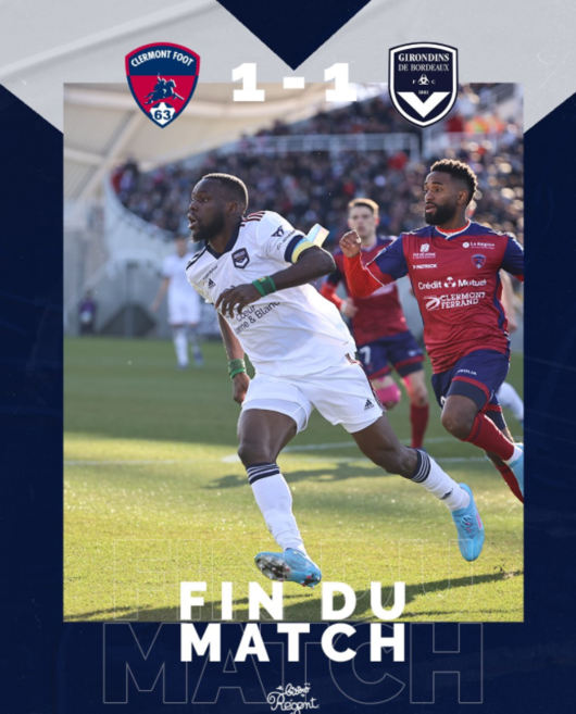 지롱댕 보르도는 27일 오후 11시(한국시간) 프랑스 클레르몽 페랑 스타드 가브리엘 피드 스타디움에서 시작한2021-2022시즌 프랑스 리그1 26라운드 클레르몽 풋과 경기서 1-1 무승부에 그쳤다.