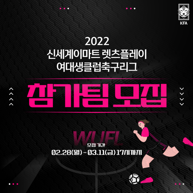 대한축구협회가 ‘2022 신세계이마트 렛츠 플레이(Let’s Play) 여대생 축구클럽 리그‘를 개최하기로 하고 참가팀을 모집한다고 밝혔다.