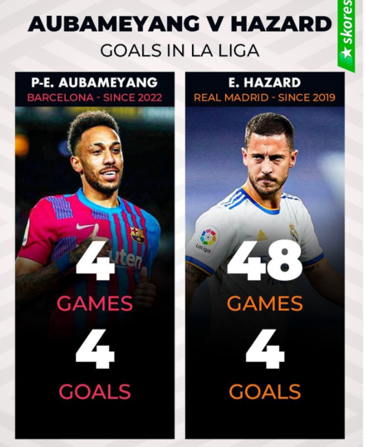 글로벌 '스코어'는 1일(한국시간) 에덴 아자르의 레알 마드리드 골기록과 피에르 오바메양의 FC 바르셀로나 골기록을 비교했다.
